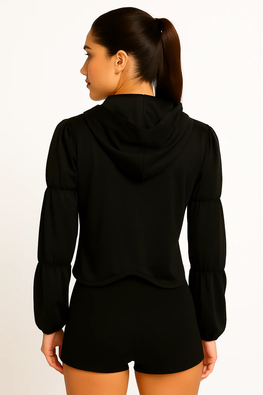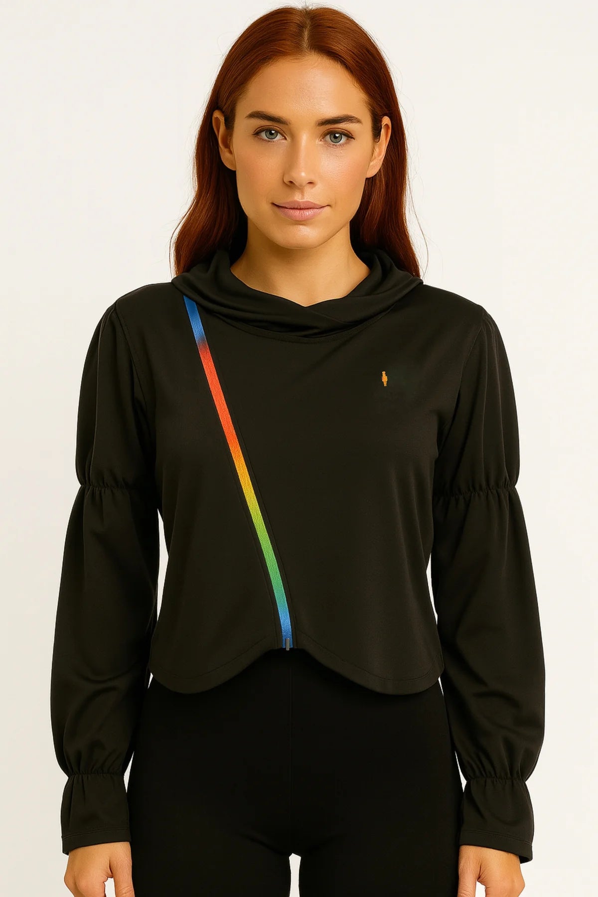 Sudadera confeccionada en tejido técnico de alta calidad. Su diseño de manga larga con recogidos sutiles que aportan un toque femenino y moderno, el cierre en tono de arcoíris vibrante y único de Lo Tuyo Es Mío.